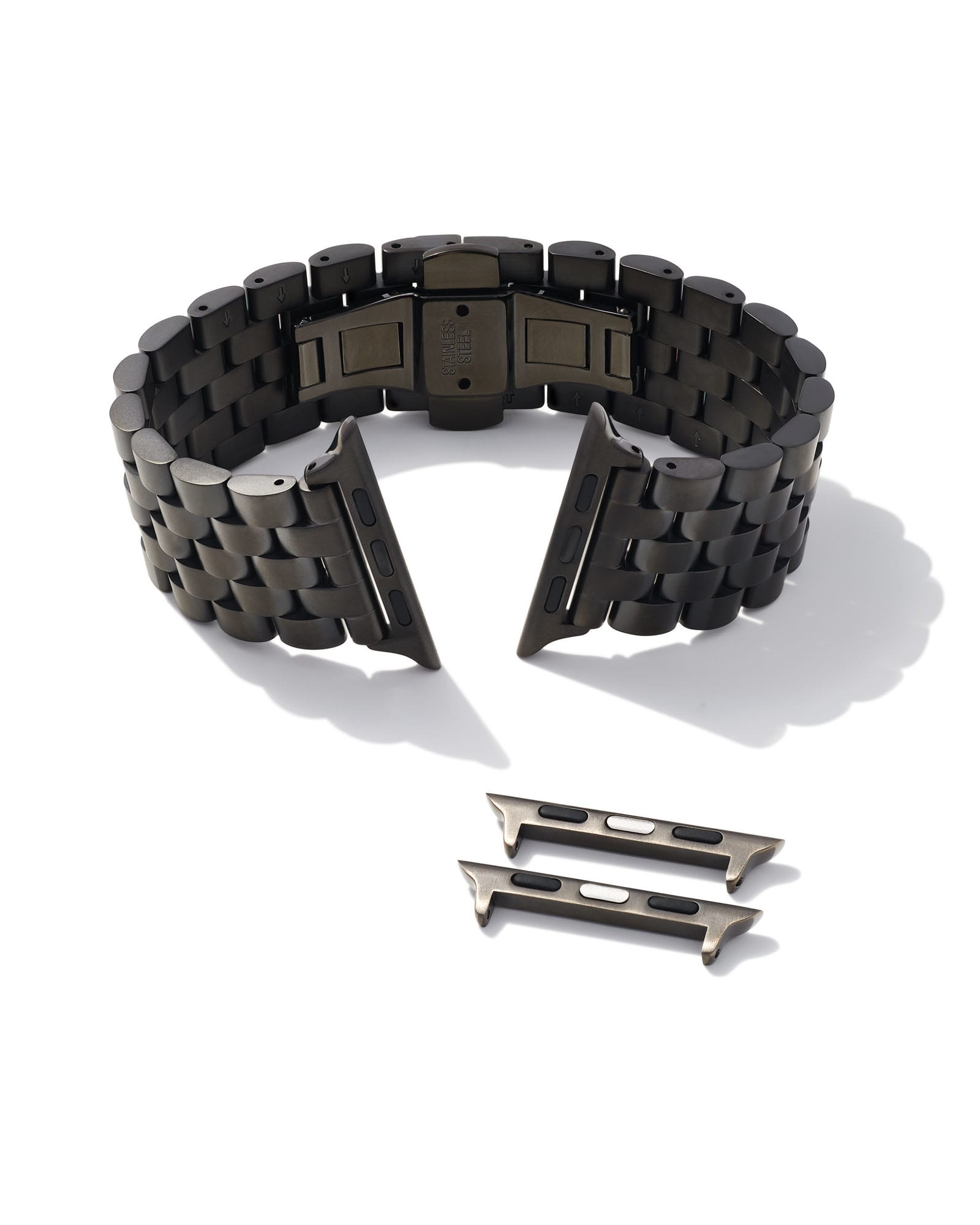 Designed to fit your Apple Watch® and Samsung Galaxy Watch®, the Beck 5 Link Watch Band in Black Stainless Steel features a rugged matte finish, everyday comfort, and classic 5-link design. To switch up your bands, simply press down on the easy release mechanism and then align each new band to the pinholes on either side of the watch.